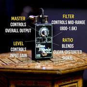 To help you create your ultimate tone, the Ultraphonix has extra gain-shaping controls beyond the original MKI version with Master Volume, Input Gain "Level", and Distortion/Saturation "Ratio". Players can fine tune their pickup outputs with the input gain "LEVEL" control to get the same reaction from the overdrive irrespective of using Single Coil or Humbucking pickups with up to 8dB of level compensation available. Plus, get additional presence and harmonic saturation using the "FILTER" knob for sculpting the upper-mids from 800Hz to 1.6kHz. Once you get the perfect mix of overdrive and EQ, use the "MASTER" volume control to set your final output level. No matter where you set it, this pedal will sound "wide-open" and "amp-like" at all volume levels.