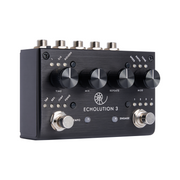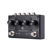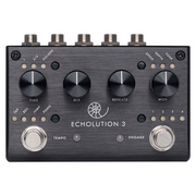 Echolution 3 is a multi-tap stereo modulation delay offering a myriad of sound design options including reverse, jump, pong, modulation tempo sync, variable low pass filter, flexible signal routing and comprehensive MIDI control. Delay times ranging from 100ms to 5 seconds can be dialed in using the Time knob or via Tap Tempo using the left footswitch. A second delay tap can be set to the same length or a fraction of the main delay time to create rhythmic echoes. The ¾ fraction creates a dotted eight note delay, while the Golden fraction uses the sacred geometry of the Golden Ratio (.382) as the multiplier for the second tap. The multi-tap settings can be even further enhanced by the stereo ping pong effect, which causes the different delay taps to switch sides on each repeat. Store up to 4 presets, unlock hidden features with the Universal Remote footswitch, and design yet unheard delay lines. Runs on standard 9VDC.